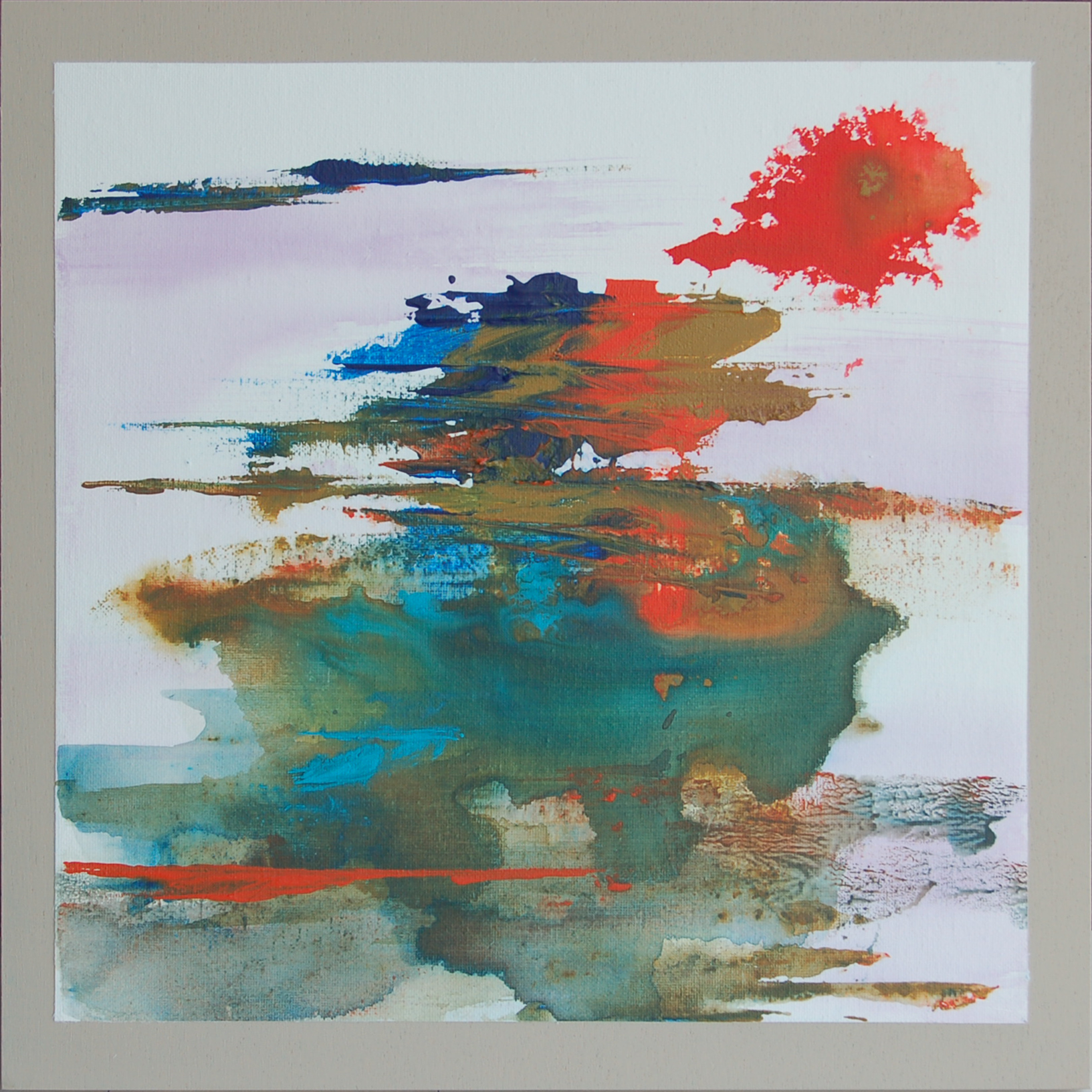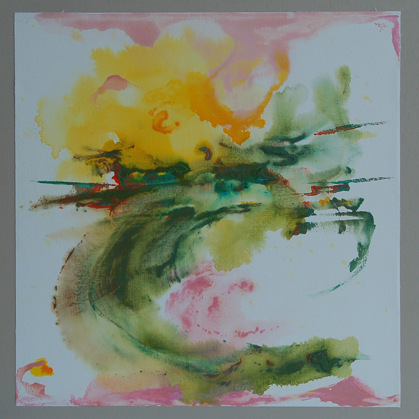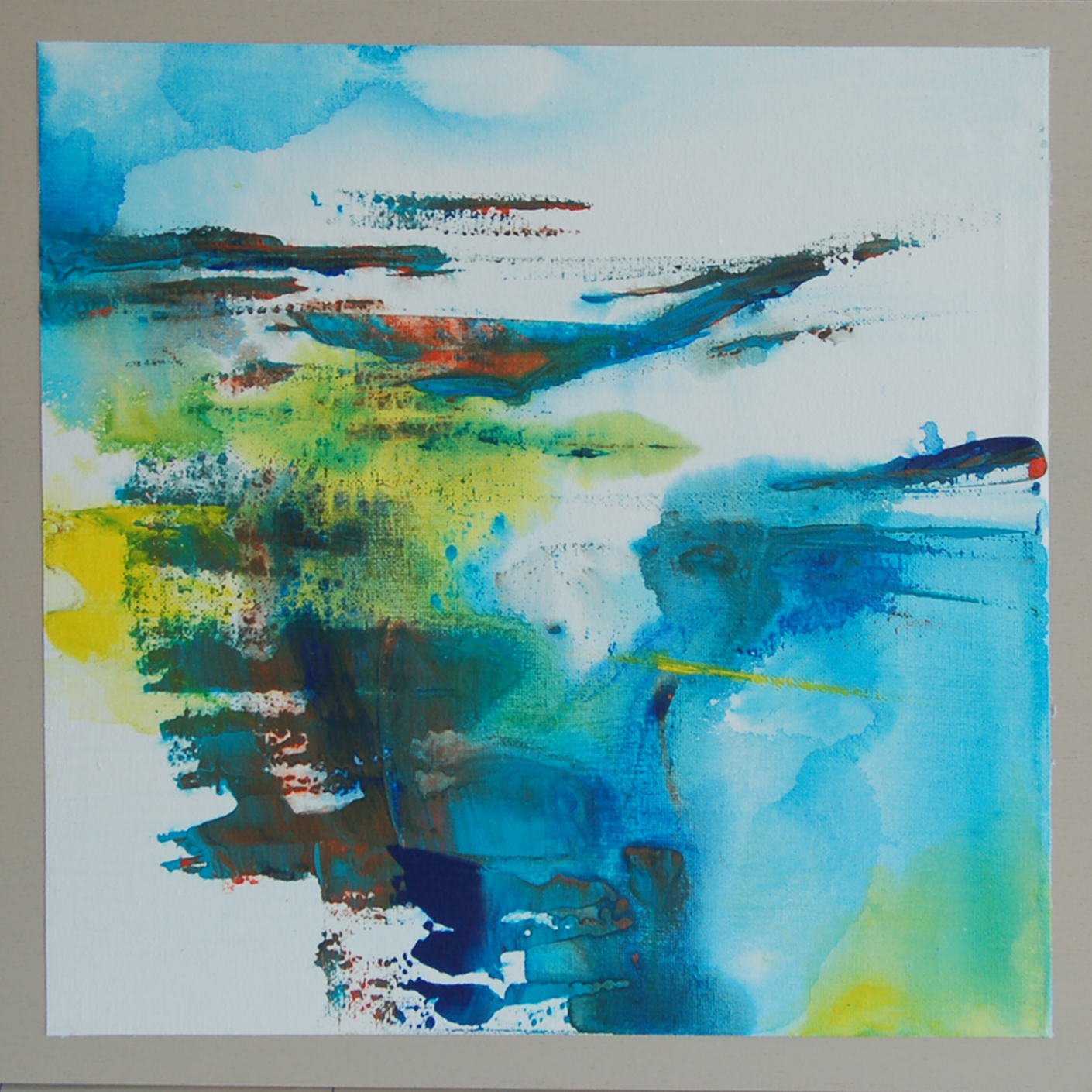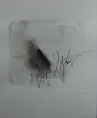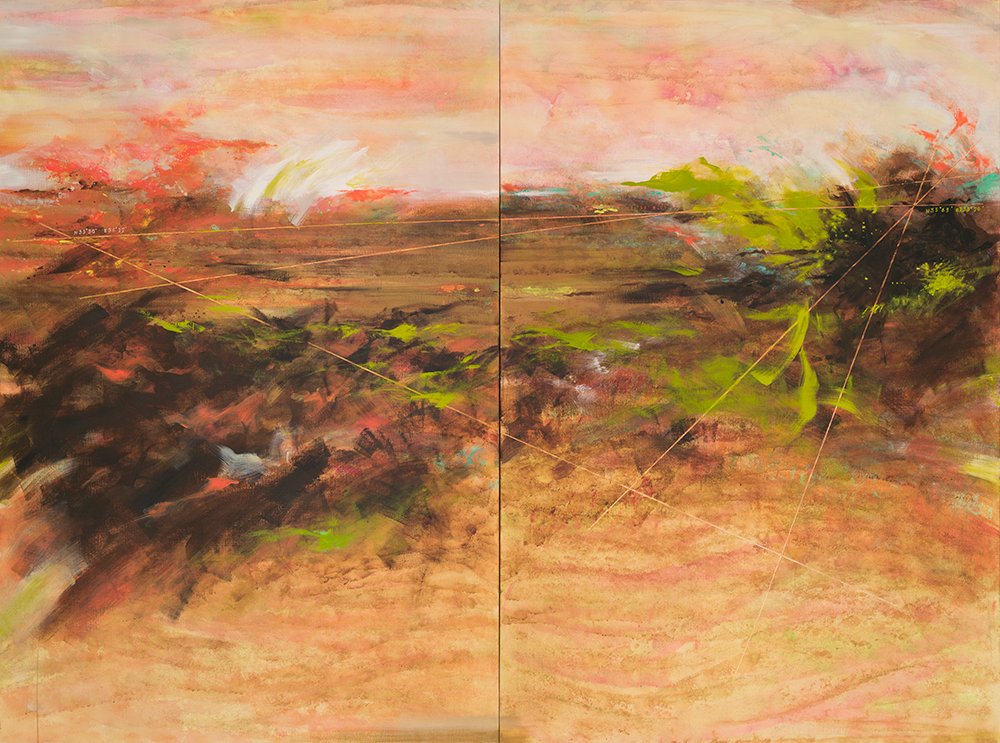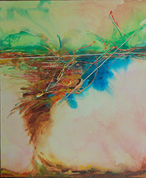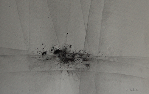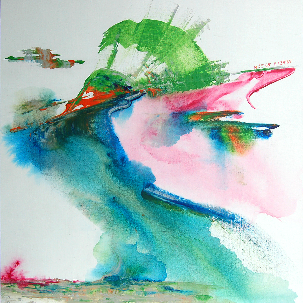 吸水性下地の上にアクリル絵の具を直接絞り出し、スキージを用いて一気に描く。水の作用を生かして滲ませたり、スキージの幅を使って擦れさせたりする。動く、止まる、勢い、時間。海を渡って水平線の向こうへ。
