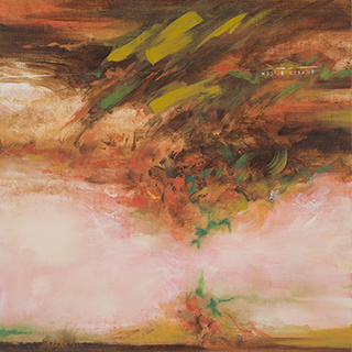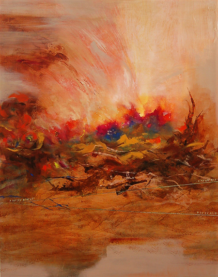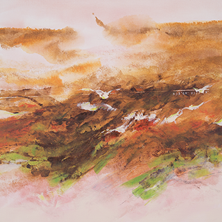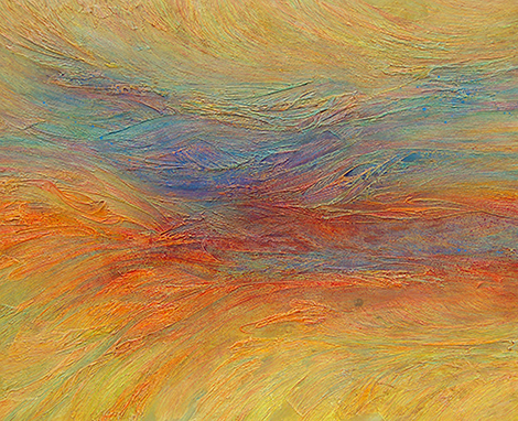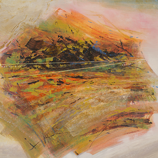 『宇宙から見た地球』という本を図書館で手にしページをめくった時、その形状と色彩、もちろん色彩は電波を反射させて得た情報に人為的な色を当てはめたものだが、目は釘付けになった。広い大地や山岳、都市部の人工的な地形は、ダイナミックで圧倒的だった。しかし他方、どこかで知った形状と色彩ーそう、岩石の拡大画像だ。偏光レンズで覗いた岩石の様子とよく似た形状。驚きと感動。なんとかして絵にしてみようと思い立った。最初はblueを基調とし、次にred、yellow と変化させながら、記号や直線を加えてさまざまな『距離』を描いた。
