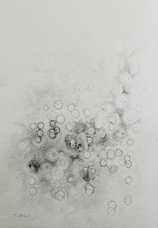 粉末グラファイトを弾いたりローラーで伸ばしたり。水性色鉛筆は十分に水に浸した画用紙を当てて使う。溶ける感じが心地よい。